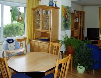 Der Eßbereich mit großem Fenster und offenem Blick ins Wohnzimmer.