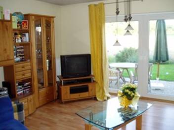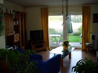 Das Wohnzimmer verfügt über große Terrassentüren mit schönem Blick ins Freien.